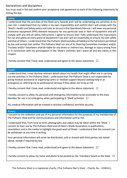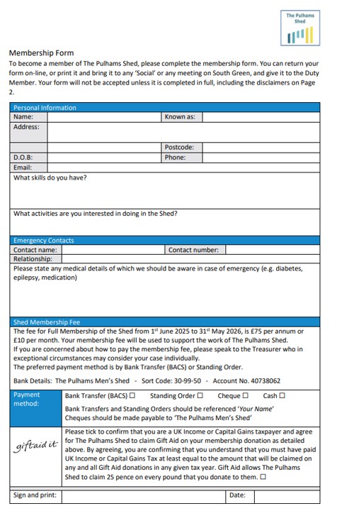 You can return your form on-line by email to membership@thepulhamsmensshed.org.uk or print it and bring it to any ‘Shed Social’ or any meeting at South Green and give it to the Duty Member.